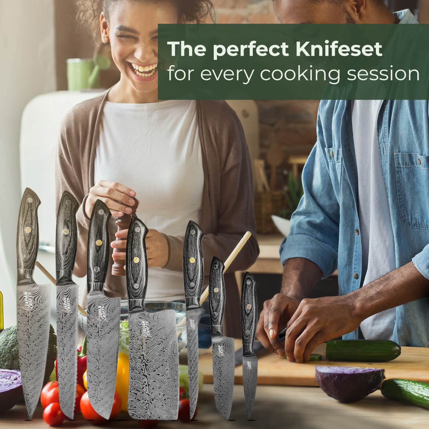 The 8-piece knife set has been specially put together to perfectly master every cutting task in the kitchen. Each knife has its own purpose: